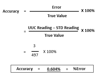 - Defined as how close your measured value (the device under calibration, or UUC) is to the “true” or reference value (STD).